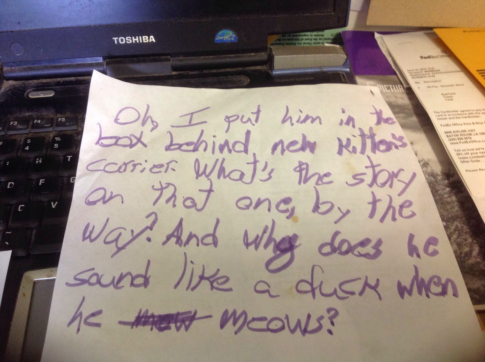 Those are some interesting notes indeed. Loved the snake one the very best. Perhaps he should have left a note for the cats too. Just saying.