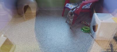 One of the kitties in this room at the shelter has learned to open the door to let himself and roomie out. You can't open the door for a picture, they rush to try to leave as i found when i tried, so this is the best i could do.